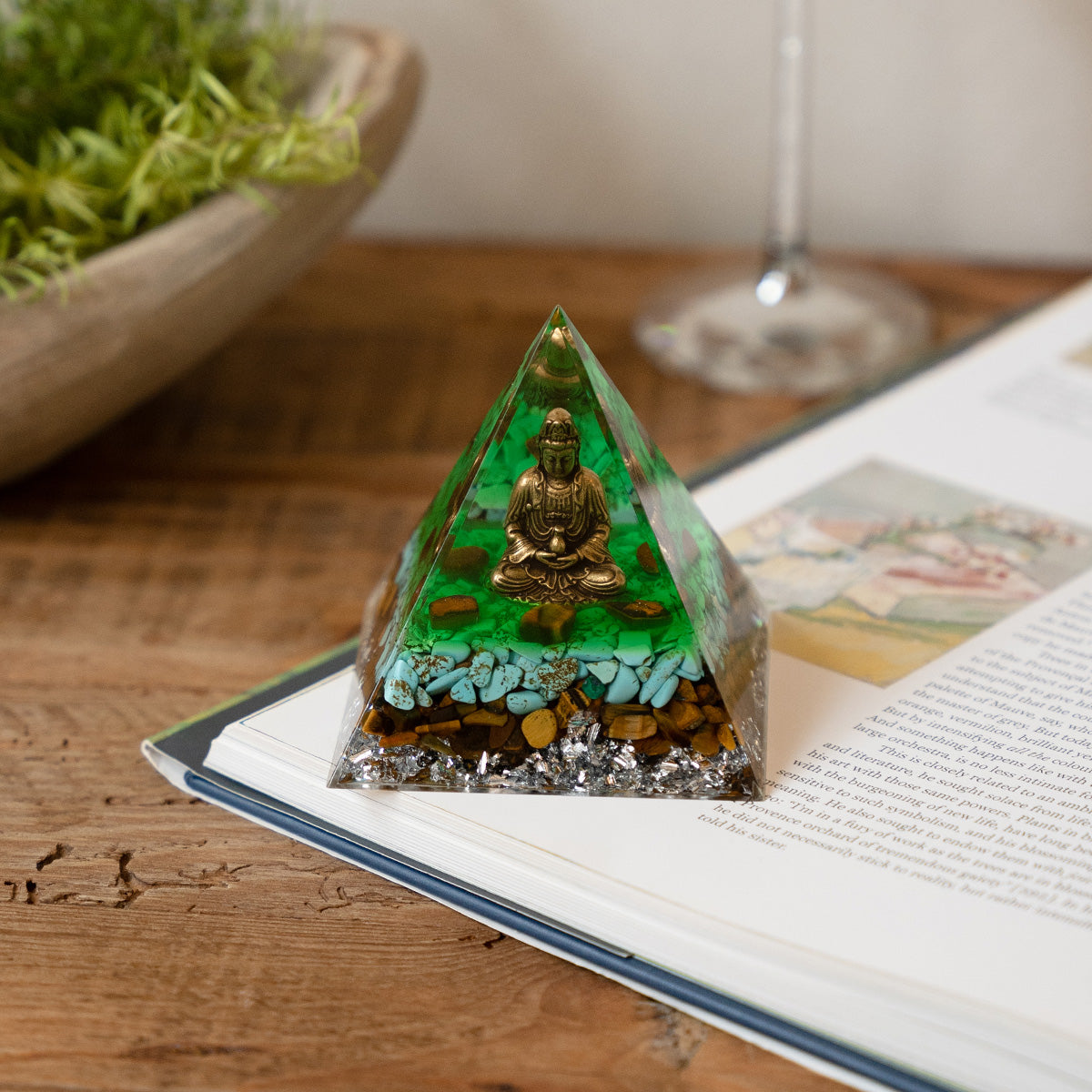 This energy pyramid is designed to balance and harmonize energies, providing a powerful tool for personal growth and spiritual development. The pyramid houses a carefully crafted Buddha statue, which serves as a beacon of peace and tranquility. Inside the pyramid, vibrant crystals and stones align to create a flow of positive energy that can help elevate your surroundings and bring a sense of calm and focus.