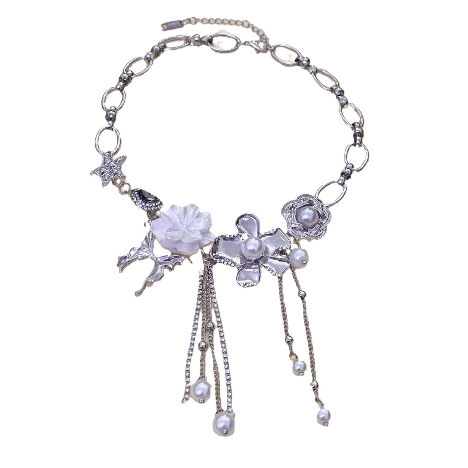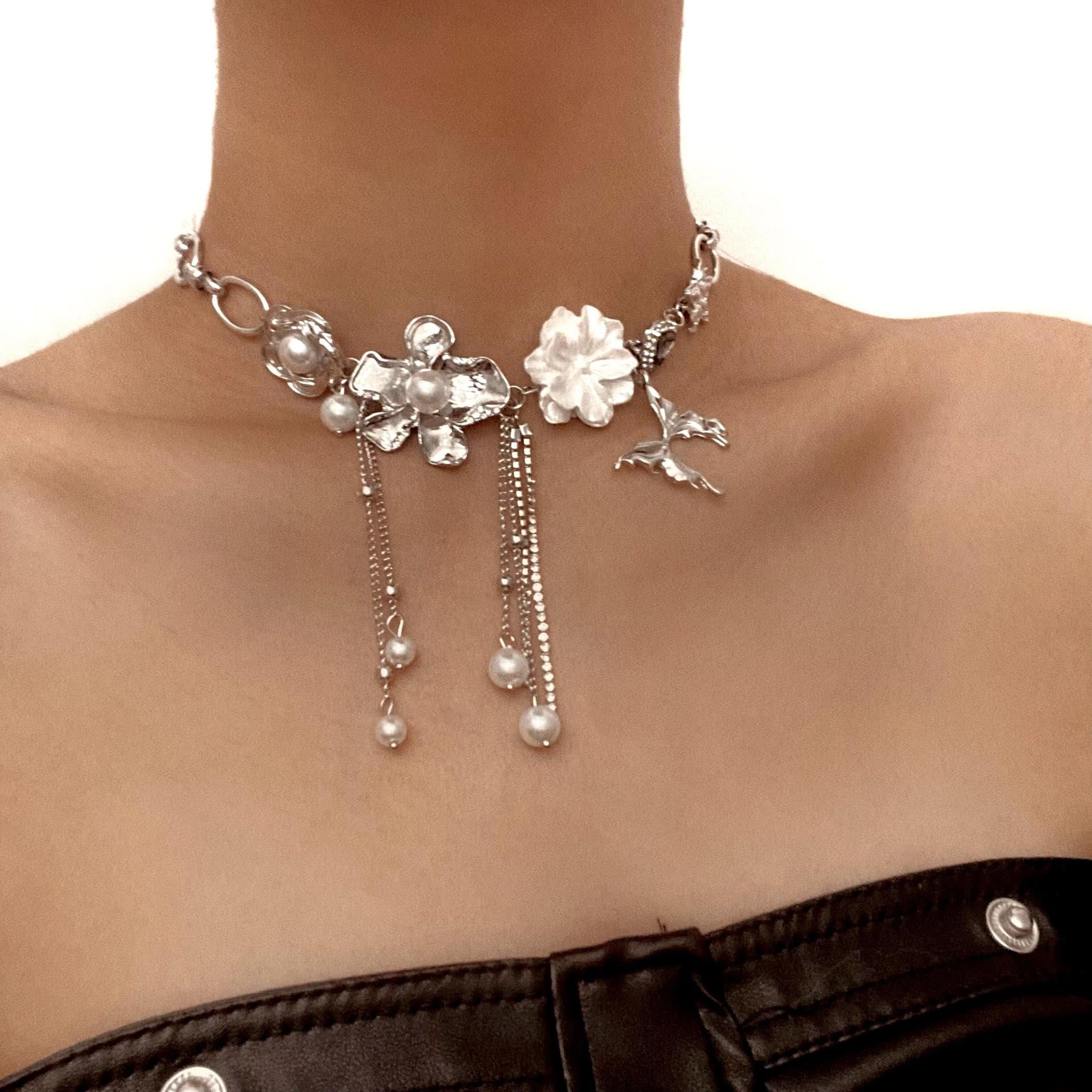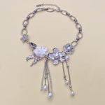 This silver-tone statement necklace blends sculpted floral charms, shimmering pearls, and mythical motifs in a dreamy, asymmetrical design. Rooted in the element Metal, it embodies clarity, refinement, and celestial alignment. Whether paired with modern streetwear or romantic evening wear, this piece awakens a sense of wonder and individuality.