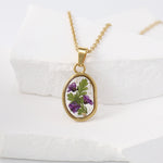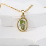 This handcrafted floral resin necklace encapsulates real dried flowers within a golden irregular frame, offering a delicate yet striking tribute to nature. Each piece is one of a kind—preserved in crystal-clear resin, reflecting individuality, peace, and inner growth. As a wearable botanical charm, it brings balance to your style and spirit. Aligned with the Wood element, it symbolizes renewal and harmony with nature.