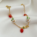 Inspired by the sweetness of blooming gardens, this bracelet features vibrant red strawberries, glistening crystal flowers, and a golden snail—all crafted with delicate enamel and sparkling stones. A symbol of joy and abundance, this piece blends nature's whimsy with a hint of magic. Associated with the Wood element, it brings fresh vitality, light-hearted energy, and a connection to growth.