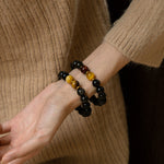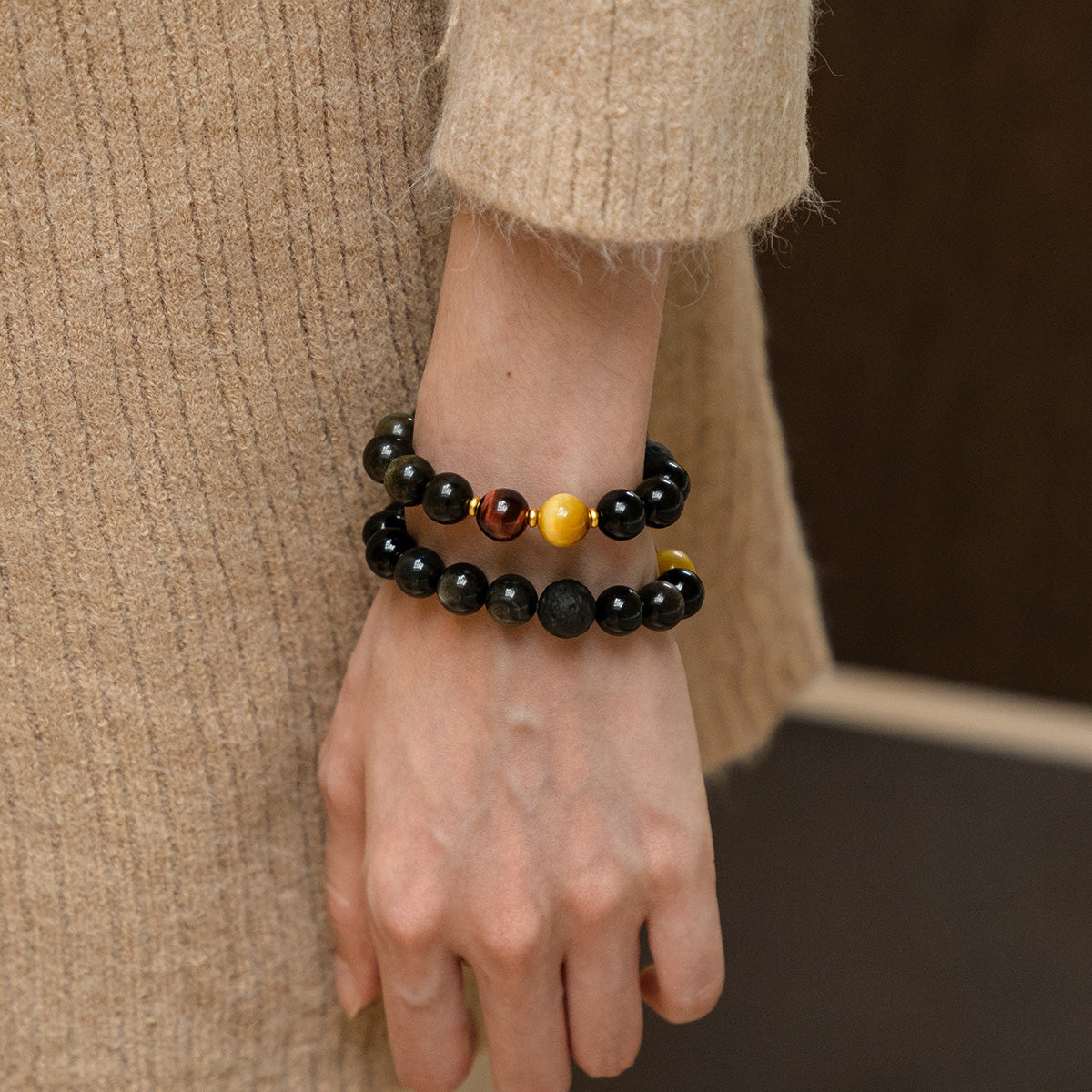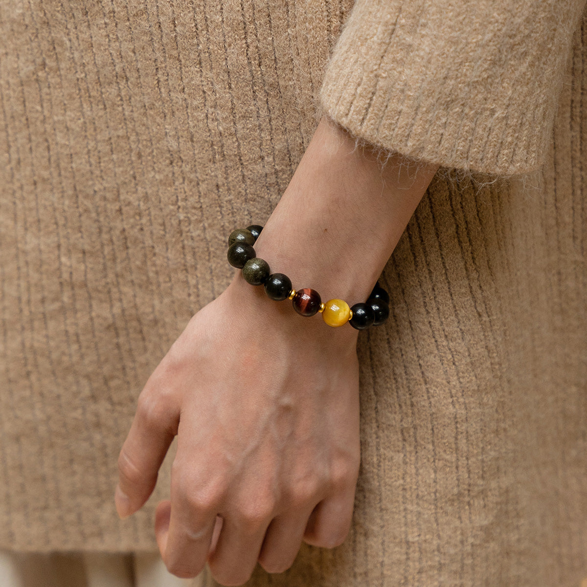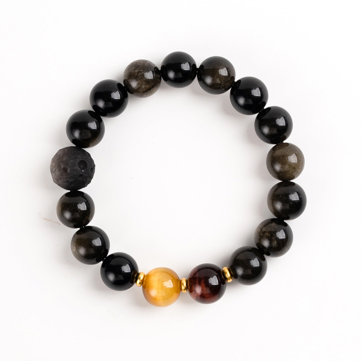 A powerful combination of Tiger's Eye trio and volcanic-inspired stones, this bracelet is crafted to enhance inner strength, deflect negativity, and align your energy with the Five Elements. The vibrant golden and red hues energize the spirit, while obsidian and meteorite tones offer grounding and protection.
